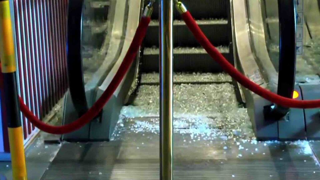 Un trabajador que se encontraba retirando los adornos navideños cayó hacia un techo de vidrio y luego sobre las escaleras eléctricas; otra persona tuvo cortaduras